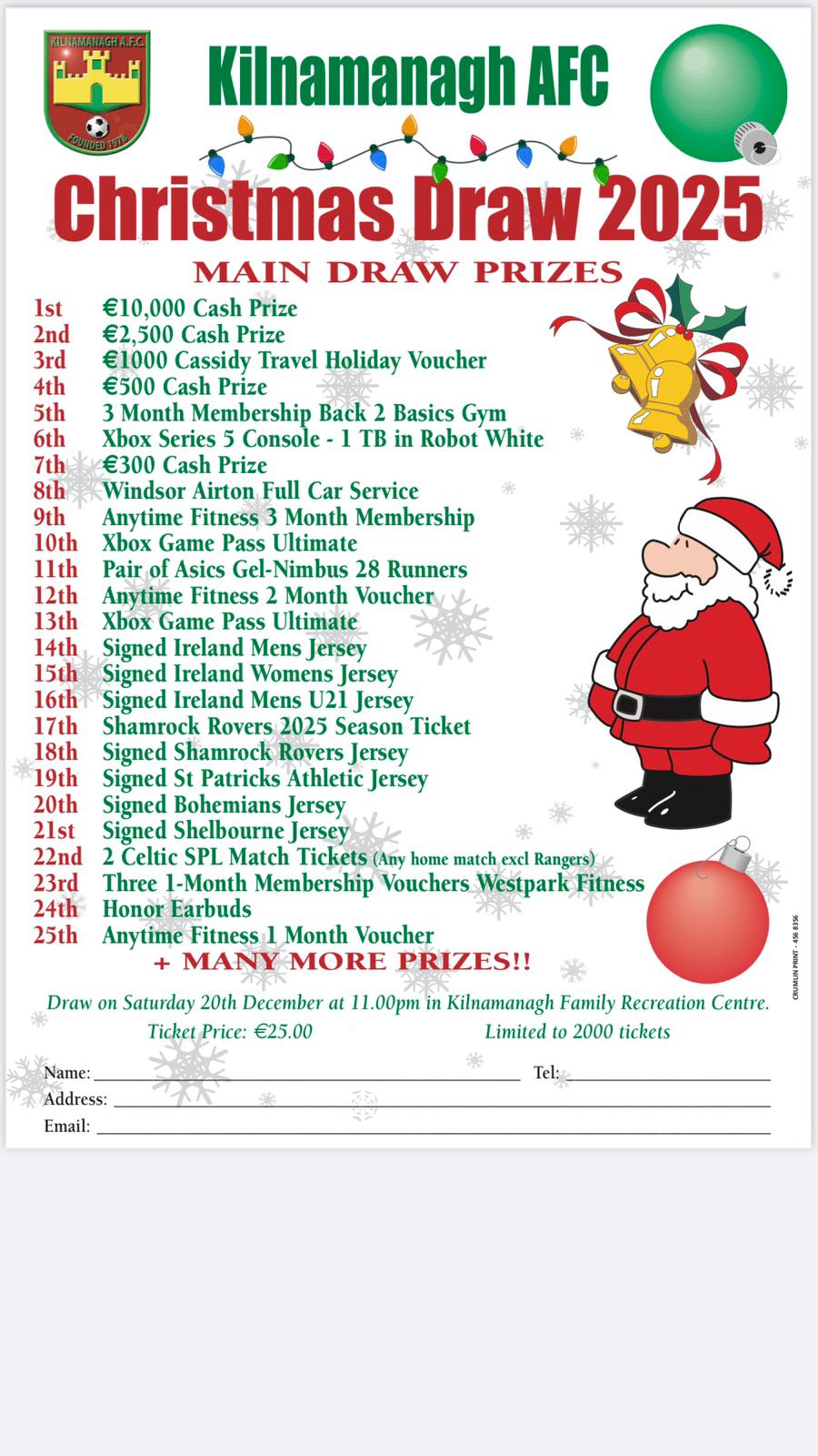 First prize €10,000 Draw on Sat 20th Dec at 11pm in Kilnamanagh Family Recreation Centre Limit 2000 tickets